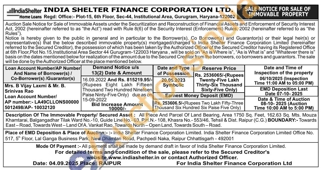 All Piece And Parcel Of Land Bearing, Area 1750 Sq. Feet, 162.63 Sq. Mts. Mouza Khamtarai, Balgangadhar Tilak Ward No.-10, Guide Line No.-03, Ρ.Η.Ν.- 108, Khasra No.-553/46, Tehsil & Dist. Raipur (C.G.) BOUNDARY:- Towards East-Road, Towards West-Land Of A. Vankat Rao, Towards North-Open Land, Towards South-Road.
