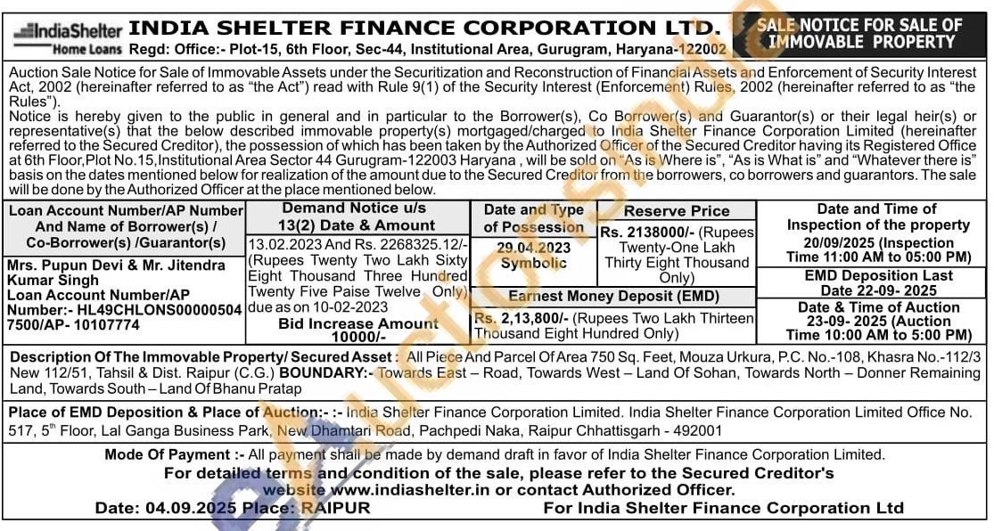 All Piece And Parcel Of Area 750 Sq. Feet, Mouza Urkura, P.C. No.-108, Khasra No.-112/3 New 112/51, Tahsil & Dist. Raipur (C.G.) BOUNDARY:- Towards East - Road, Towards West - Land Of Sohan, Towards North - Donner Remaining Land, Towards South-Land Of Bhanu Pratap