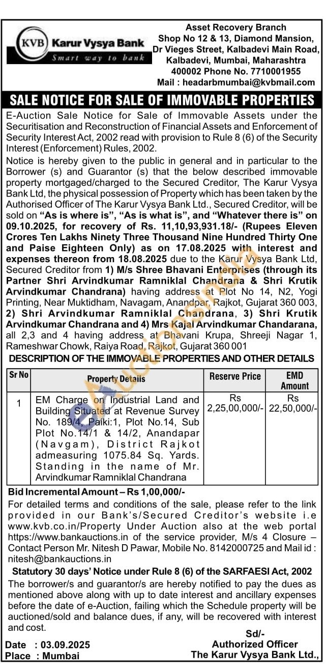EM Charge on Industrial Land and Building Situated at Revenue Survey No. 189/4, Paiki: 1, Plot No.14, Sub Plot No.14/1 & 14/2, Anandapar (Navgam), District Rajkot admeasuring 1075.84 Sq. Yards. Standing in the name of Mr. Arvindkumar Ramniklal Chandrana