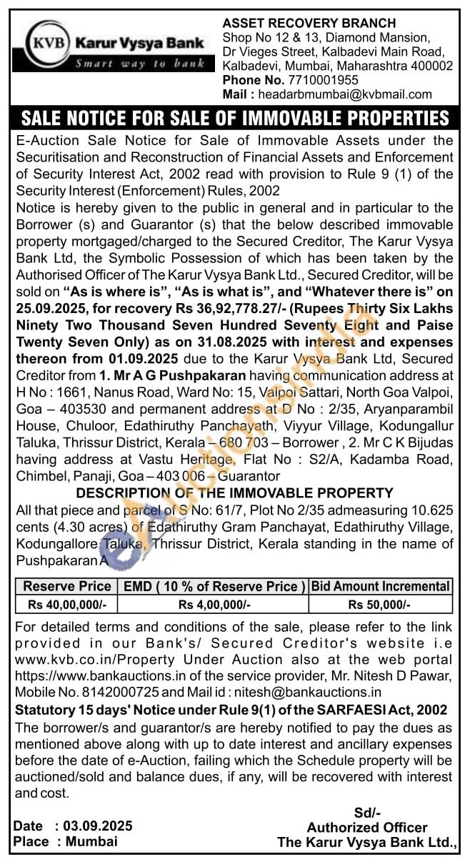 All that piece and parcel of S No: 61/7, Plot No 2/35 admeasuring 10.625 cents (4.30 acres) of Edathiruthy Gram Panchayat, Edathiruthy Village, Kodungallore Taluka, Thrissur District, Kerala standing in the name of Pushpakaran A
