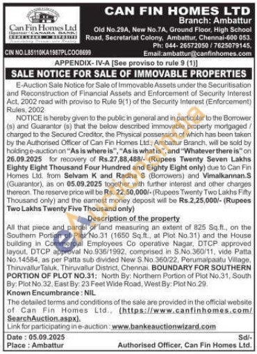 Description of the property : All that piece and parcel of land measuring an extent of 825 Sq.ft., on the Southern Portion of Plot No.31 (1650 Sq.ft., at Plot No.31) and the House building in Commercial Employees Co operative Nagar, DTCP approved layout, DTCP approval No.936/1992, comprised in S.No.360/11, vide Patta No.14584, as per Patta sub divided New S.No. 360/22, Perumalpaatu Village, Thiruvallur Taluk, Thiruvallur District, Chennai. BOUNDARY FOR SOUTHERN PORTION OF PLOT NO.31: North By: Northern Portion of Plot No.31, South By: Plot No.32. East By: 23 Feet Wide Road, West By: Plot No.29