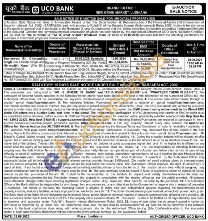All Parts and Parcel of Property Measuring 300 Sq. Yards Comprising in Khasra No. 1578, Khata No. 1870/2534, As per Jamabandi for the year 2000-01, Situated within the Revenue Estate of Village Gill-2 hadbast No.263 (above New Guru Teg Bahadur Nagar), Tehsil & District Ludhiana. Bounded as under: East: Street 20 Feet Wide, West: Khalsa Sen. Sec. School 45-0", North: Khalsa Sen. Sec. School 60-0, South: Khalsa Sen. Sec. School 60-0", Registered Vide Title Deed/Vasika No. 1567 Dated 23.04.2003 with Sub Registrar, Ludhiana in the name of Sh. Charanjit Singh Sio Chetan Singh.