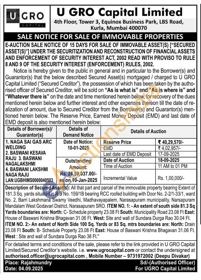 All that part and parcel of the immovable property bearing Extent of 181.3 Sq. yards situated in R.S No. 159/1B bearing RCC roofed building with Door No. 2-2/1-33/1, ward No. 2, Barri Lakshmana Swamy Veedhi, Madhavayapalem, Narasapuram municipality, Narsapuram Mandalam West Godavari District, Narasapuram SRO. ITEM NO. 1: An extent of south side 81.3 Sq Yards boundaries are: North: C- Schedule property 23.08 Ft South: Municipality Road 23.08 Ft East: House of Baswani Krishna Bhagavan 31.06 Ft. West: Site and wall of Sundara Durga Rao 30.04 Ft. ITEM NO. 2:- An extent of North Side 100 Sq. Yards or 83 Sq. mtrs boundaries are: North: Drain 23.08 Ft South: B- Schedule Property 23.08 Ft East: House of Baswani Krishna Bhagavan 31.06 Ft. West: Site and wall of Sundara Durga Rao 38 Ft."