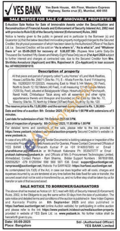 Description of property : All that piece and parcel of property called "Lucky Homes" of Land Mark Realties, House List/Site No. 256/71 (Site No. 71), E-Khata Form No. 9 and 11A bearing No. 152800201701320325, measuring East to West 9.144 Meters (30 Feet), North to South 12.192 Meters (40 Feet), in all measuring 111.48 Square Meters (1200 Sq. Feet), situated at Balajigapade Village, Hosahudya Gram Panchayath, Nandi Hobli, Chikballapur Taluk along with all easement and other rights appurtenance thereto and threupon and bounded on the: East by: Site No. 72, West by: Site No. 70, North by: 9 Meter (30Feet) Road, South by: Sy. No. 120