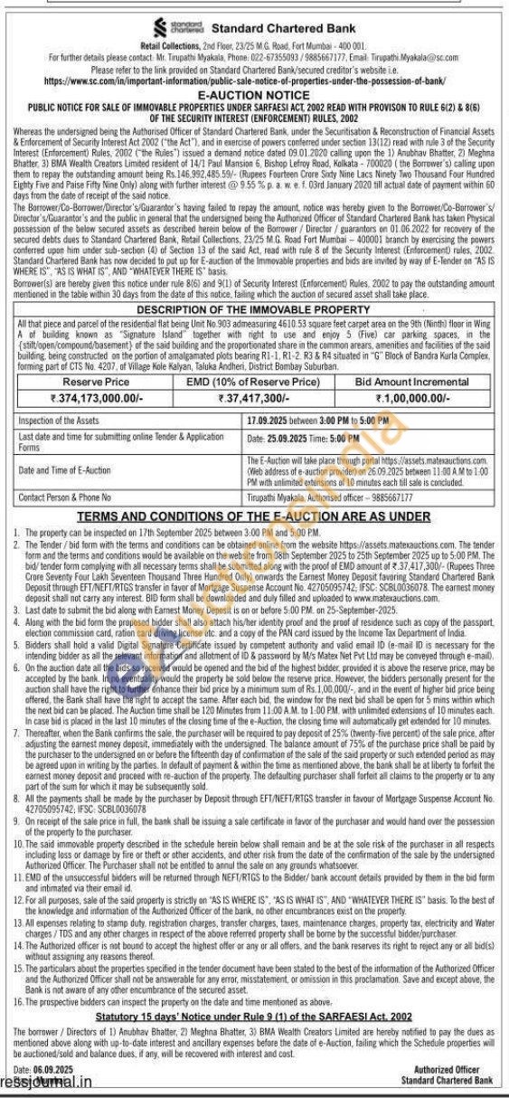 All that piece and parcel of the residential flat being Unit No.903 admeasuring 4610.53 square feet carpet area on the 9th (Ninth) floor in Wing A of building known as "Signature Island together with right to use and enjoy 5 (Five) car parking spaces, in the (stilt/open/compound/basement) of the said building and the proportionated share in the common arears, amenities and facilities of the said building, being constructed on the portion of amalgamated plots bearing R1-1, R1-2. R3 & R4 situated in "G" Block of Bandra Kurla Complex, forming part of CTS No. 4207, of Village Kole Kalyan, Taluka Andheri, District Bombay Suburban