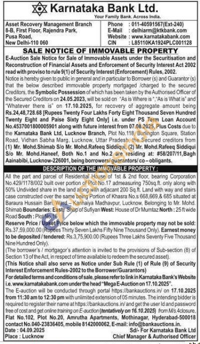 All the part and parcel of Residential House of 1st & 2nd floor, bearing Corporation No.429/1178/002 built over portion of Plot No.17 admeasuring 750sq.ft. only along with 50% Undivided share in the land along with adjacant 200 Sq.ft. Land with way and stairs case constructed over the same being Portion of Khasra No.s 668,669,& 685 situated at Baraura Hussain Bari, Ward-Kanhaiya Madhavpur, Lucknow. Belonging to Mr. Mohd. Shimab Boundaries: East: Shop of Sufiyan West: House of Dr Mumtaz North: 25 ft wide Road South: Plot No. 16