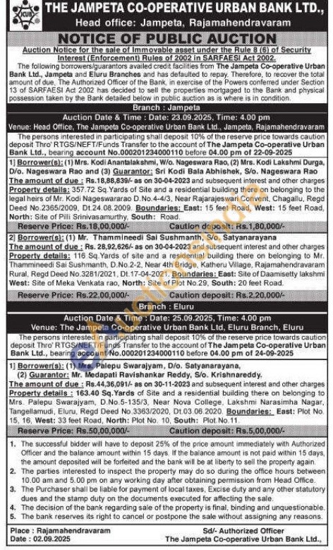 Property details: 163.40 Sq. Yards of Site and a residential building there on belonging to Mrs. Palepu Swarajyam, D.No.5-135/3, Near Nova College, Lakshmi Narasimha Nagar, Tangellamudi, Eluru, Regd Deed No. 3363/2020, Dt.03.06.2020. Boundaries: East: Plot No. 15, 16, West: 33 feet Road, North: Plot No. 10, South: Plot. No. 11