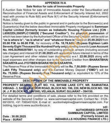 PROPERTY BEARING PLOT NO. 114, SHYAM LAKE CITY, NR. RAMVATIKA VIBHAG-3, SAYAN KATHOR ROAD, BLOCK NO. 196, 220, NEW BLOCK NO. 196 (K.J. P. BLOCK NO. 196/300), VELANJA, SURAT, GUJARAT-394150