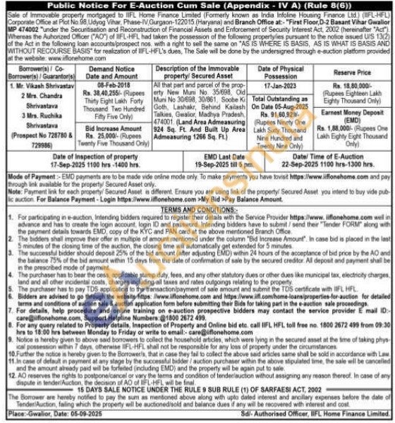 All that part and parcel of the property New Muni No. 35/698, Old Muni No 30/698, 30/861, Soobe Ki Goth, Lashakr, Behind Kailash Talkies, Gwalior, Madhya Pradesh 474001. (Land Area Admeasuring 924 Sq. Ft. And Built Up Area Admeasuring 1266 Sq. Ft.)