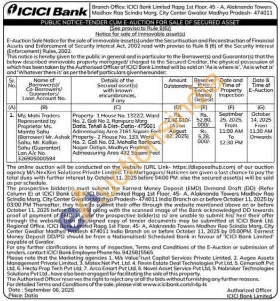 Property- 1 House No. 1322/2, Ward No. 2. Gali No 2. Ranipura Marg Datia, Tehsil & Dist-Datia-475661 Admeasuring Area 2161 Square Feet Property-2 House No. 133, Ward No. 2. Gali No. 02, Mohalla Ranipura. Nagar Datiya, Madhya Pradesh Admeasuring Area 432 Square Feet