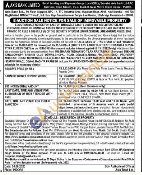 Equitable Mortgage Of All That Piece And Parcel Of The Property Situated House No.98/108(Old.38.59 Block No.788) Survey No.234/1 And 212/2, Motilal Nehru Marg (Station Road) Dewas, Madhya Pradesh. Having Total Area 8000 Sq.Ft. in The Name Of Sheetal Trehan WIO Sharad Trehan, Manju Trehan WIO Ranjeet Trehan. Vaneeta Trehan W/O Anil Salhotra. The Boundraries Are As Follows. East: Plot Of Parasmal Jain West: Gurudwara Road North: Gai South: Station Road
