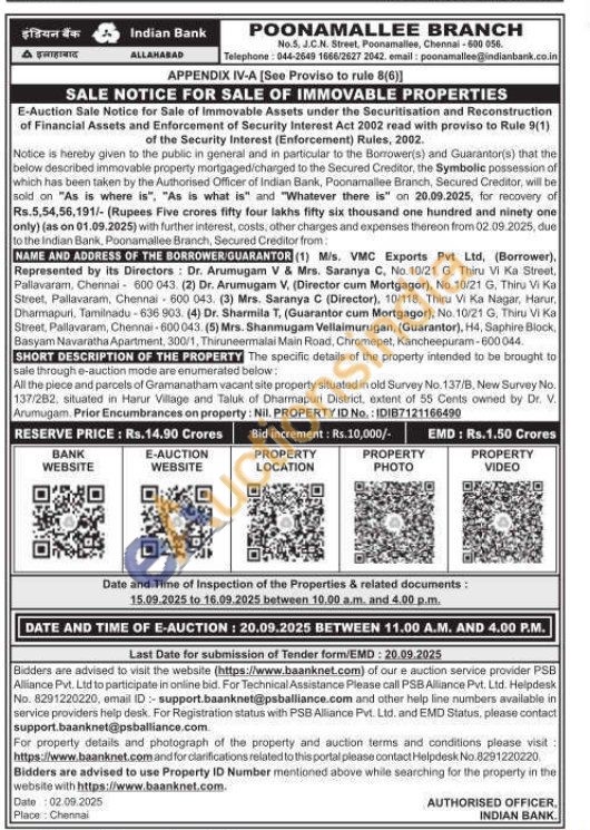 All the piece and parcels of Gramanatham vacant site property situated in old Survey No. 137/B, New Survey No. 137/282, situated in Harur Village and Taluk of Dharmapuri District, extent of 55 Cents owned by Dr. V. Arumugam. Prior Encumbrances on property: Nil. PROPERTY ID No.: IDI87121166490