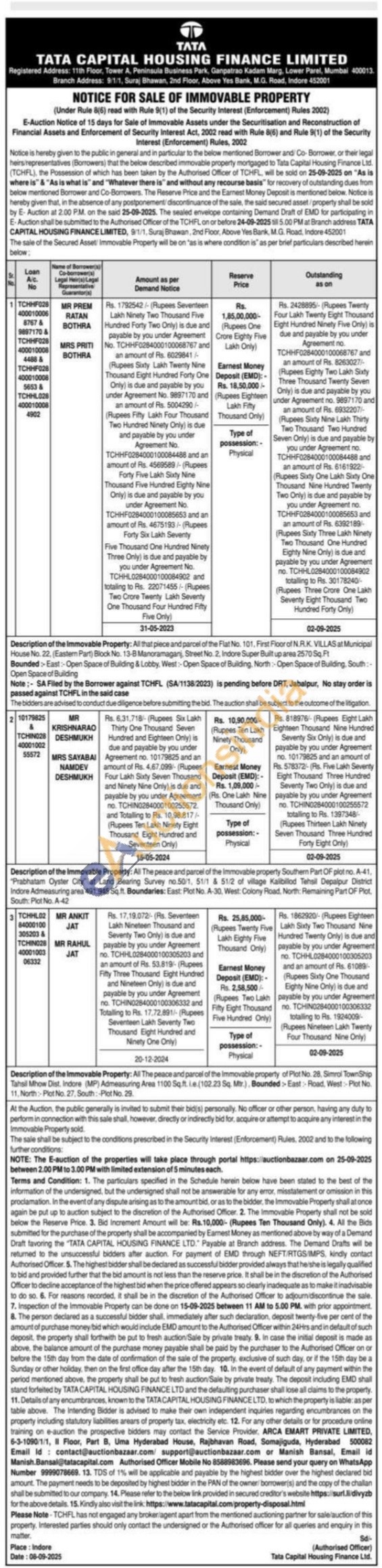 Description of the Immovable Property: All that piece and parcel of the Flat No. 101, First Floor of N.R.K. VILLAS at Municipal House No. 22, (Eastern Part) Block No. 13-B Manoramaganj, Street No. 2. Indore Super Built up area 2570 Sq. Ft Bounded:- East: Open Space of Building & Lobby, West: Open Space of Building, North: Open Space of Building, South: Open Space of Building Note:- SA Filed by the Borrower against TCHFL (SA/1138/2023) is pending before DRT, Jabalpur, No stay order is passed against TCHFL in the said case The bidders are advised to conduct due diligence before submitting the bid. The auction shall be subject to the outcome of the litigation