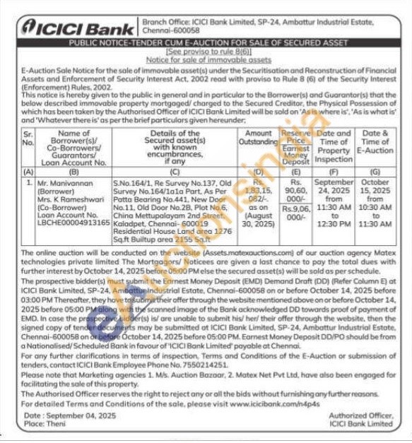 S.No. 164/1, Re Survey No.137, Old Survey No.164/1010 Part. As Per Patta Bearing No.441, New Door No.11, Old Door No. 28. Plot No.6, China Mettupalayam 2nd Street, Kaladpet, Chennai-600019 Residential House Land area 1276 Sq.ft Builtup area 2155 Sq.ft
