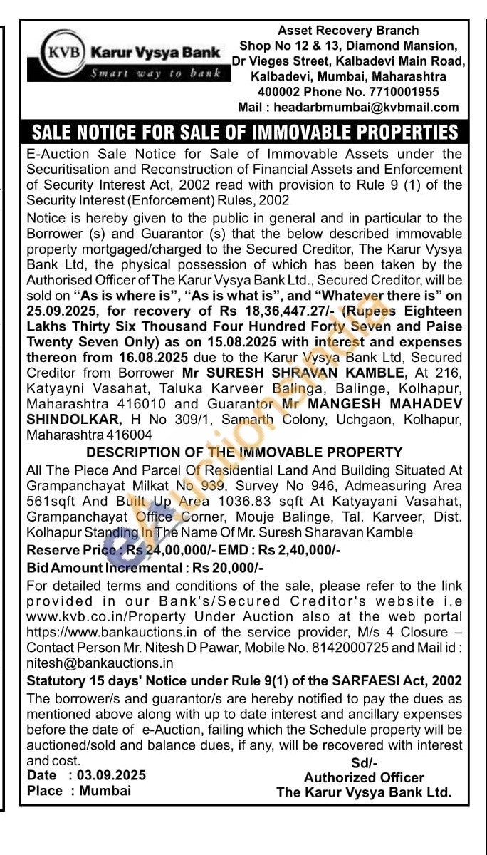 All The Piece And Parcel Of Residential Land And Building Situated At Grampanchayat Milkat No 939, Survey No 946, Admeasuring Area 561sqft And Built Up Area 1036.83 sqft At Katyayani Vasahat, Grampanchayat Office Corner, Mouje Balinge, Tal. Karveer, Dist. Kolhapur Standing In The Name Of Mr. Suresh Sharavan Kamble