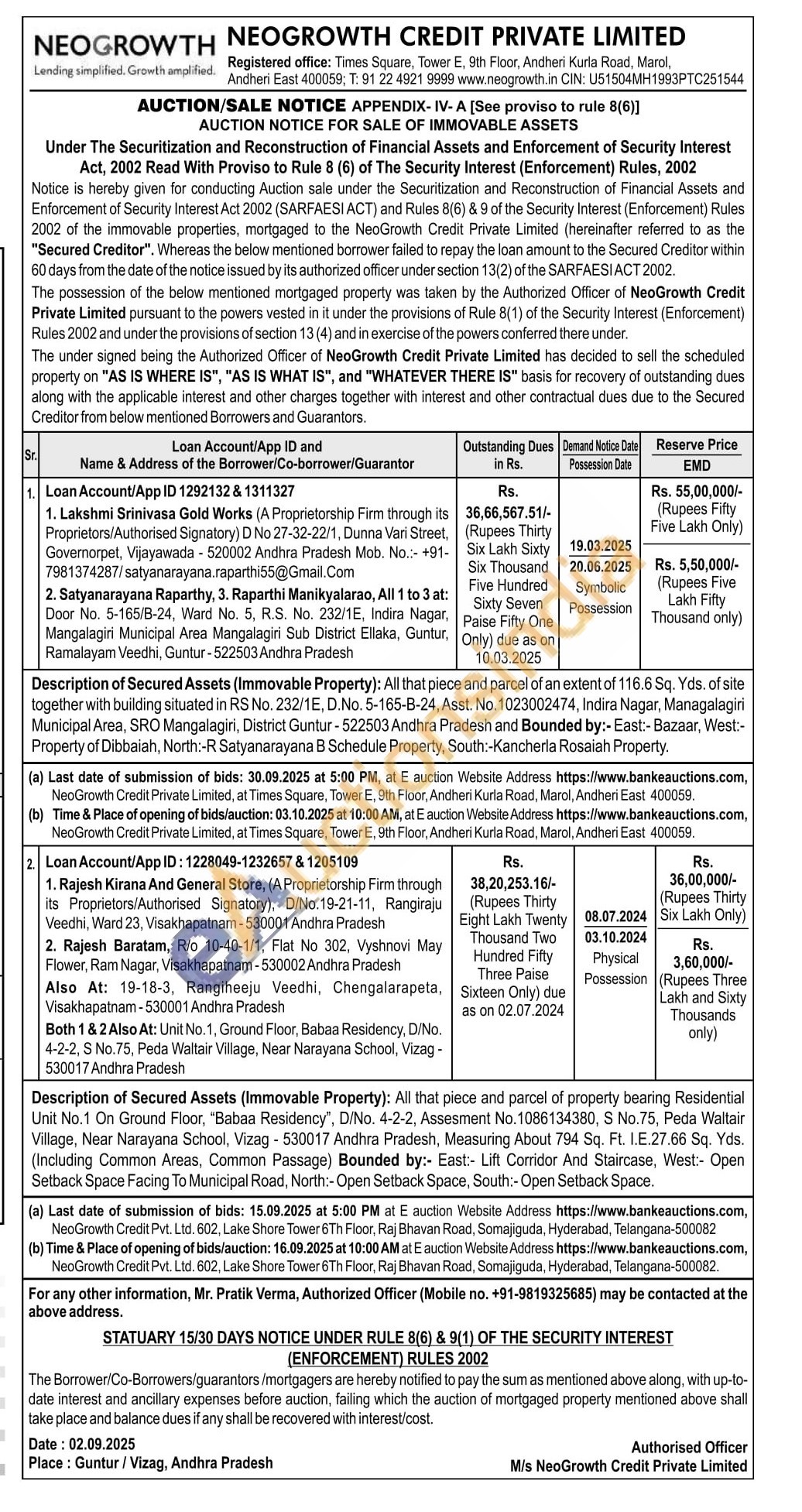 Description of Secured Assets (Immovable Property): All that piece and parcel of an extent of 116.6 Sq. Yds. of site together with building situated in RS No. 232/1E, D.No. 5-165-B-24, Asst. No. 1023002474, Indira Nagar, Managalagiri Municipal Area, SRO Mangalagiri, District Guntur-522503 Andhra Pradesh and Bounded by:- East:- Bazaar, West:-Property of Dibbaiah, North:-R Satyanarayana B Schedule Property, South:-Kancherla Rosaiah Property