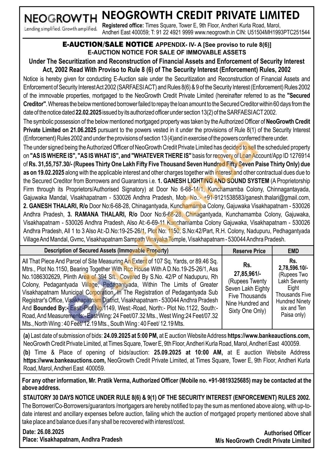Mr. Pratik Verma, Authorized Officer (Mobile no. +91-9819325685