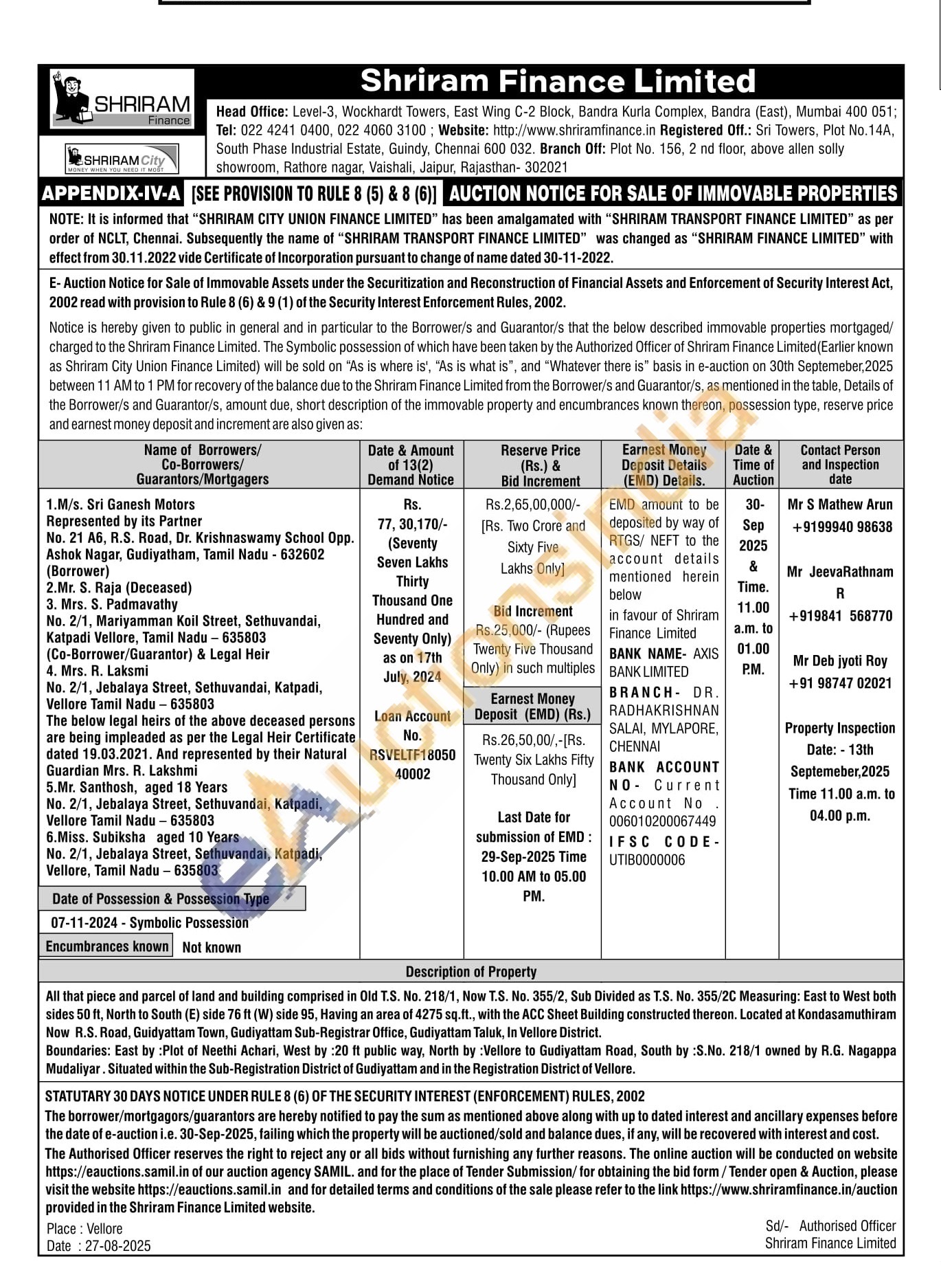 All that piece and parcel of land and building comprised in Old T.S. No. 218/1, Now T.S. No. 355/2, Sub Divided as T.S. No. 355/2C Measuring: East to West both sides 50 ft, North to South (E) side 76 ft (W) side 95, Having an area of 4275 sq.ft., with the ACC Sheet Building constructed thereon. Located at Kondasamuthiram Now R.S. Road, Guidyattam Town, Gudiyattam Sub-Registrar Office, Gudiyattam Taluk, In Vellore District.