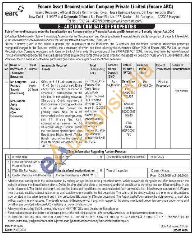 Office no. 3168, admeasuring area 141.48 Sq mtrs out of said Entire office space No. 316, described in schedule B hereinabove on the third floor in the building known as Shoppers Orbit Apartment Condominium including exclusive right to use Two covered car parking space Nos. 90 & 91 constructed on land bearing survey no: 44, Hissa No. A/1, corresponding survey no. 50 situated at Village Dhanori, within the registration district Pune, Sub Registration District Haveli, Taluka Haveli and within the Limits of Pune Municipal Corporation, Pune -411015
