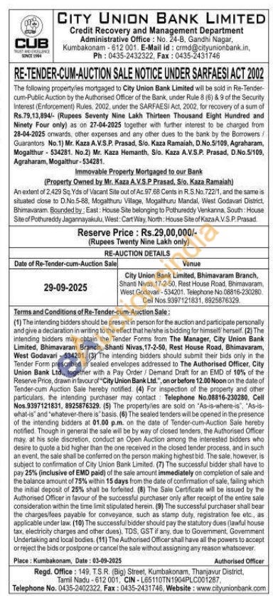 An extent of 2,429 Sq. Yds of Vacant Site out of Ac.97.68 Cents in R.S.No. 722/1, and the same is situated close to D.No.5-88, Mogalthuru Vilage, Mogalthuru Mandal, West Godavari District, Bhimavaram Bounded by, East House Site belonging to Pothureddy Venkanna, South: House Site of Pothureddy Jagannayakulu, West: Cart Way, North: House Site of KazaA.V.S.P. Prasad