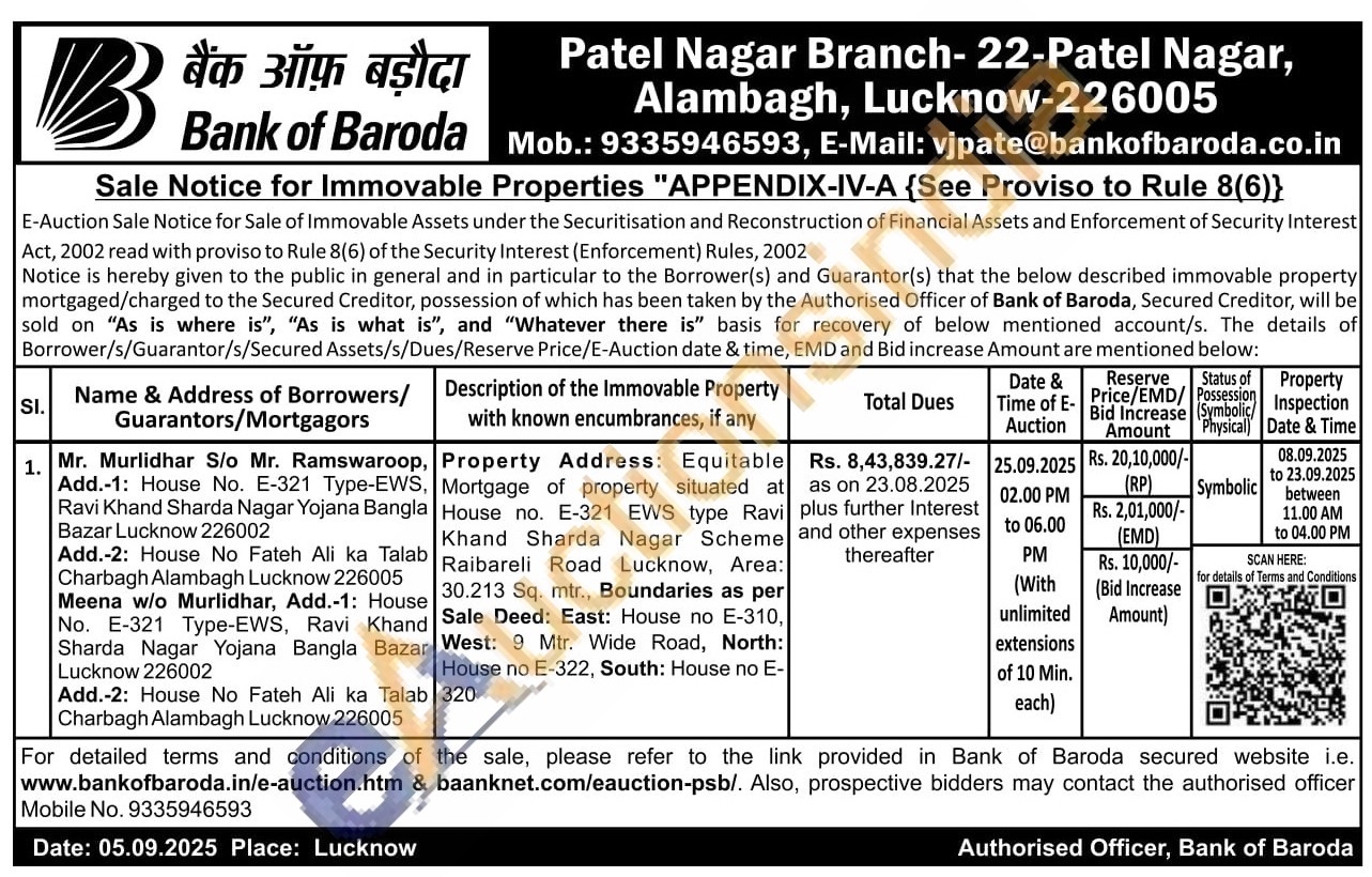 Mortgage of property situated at House no. E-321 EWS type Ravi Khand Sharda Nagar Scheme Raibareli Road Lucknow, Area: 30.213 Sq. mtr., Boundaries as per Sale Deed: East: House no E-310, West: 9 Mtr. Wide Road, North: House no E-322, South: House no E-320