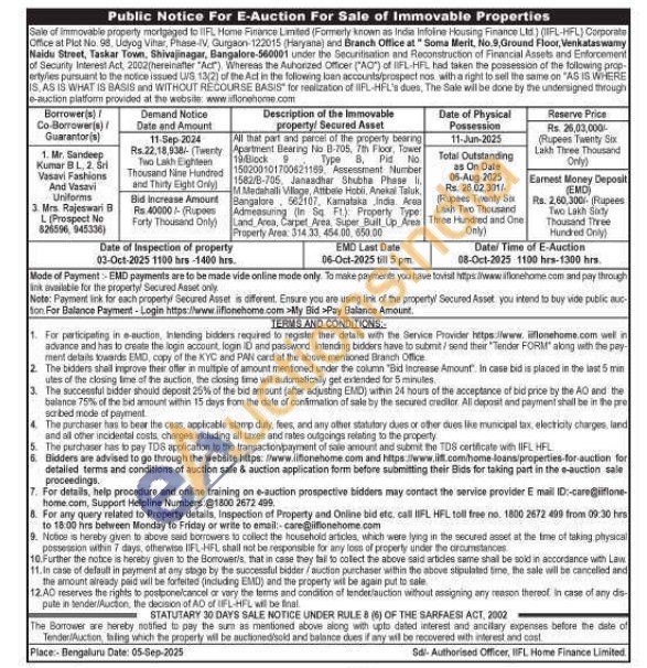 All that part and parcel of the property bearing Apartment Bearing No 8-705, 7th Floor, Tower 19/Block Type 8, Pid No 150200101700621159. Assessment Number 1582/8-705 Janaadhar Shubha Phase li M Medahalli Willage, Attibele Hobii, Anekal Taluk, Bangalore, 562107, Kamataika India Area Admeasuring (In Sq Ft) Property Type: Land Area, Carpet Area Super Bull Up Area Property Area: 314,33, 454 00, 650.00
