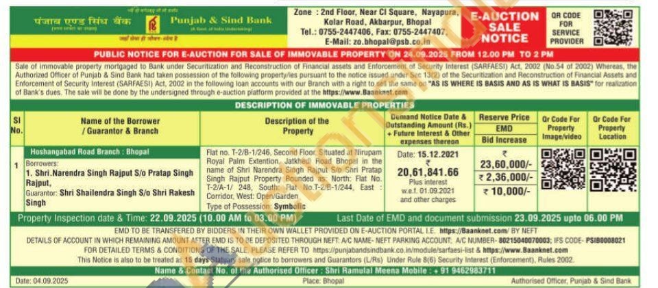 Flat no. T-2/8-1/246, Second Floor, Situated at Nirupam Royal Palm Extention, Jatkhedi Road Bhopal in the name of Shri Narendra Singh Rajput S/o Shri Pratap Singh Rajput Property Bounded as: North: Flat No. T-2/A-1/ 248, South: Flat No.T-2/8-1/244, East: Corridor, West: Open/Garden