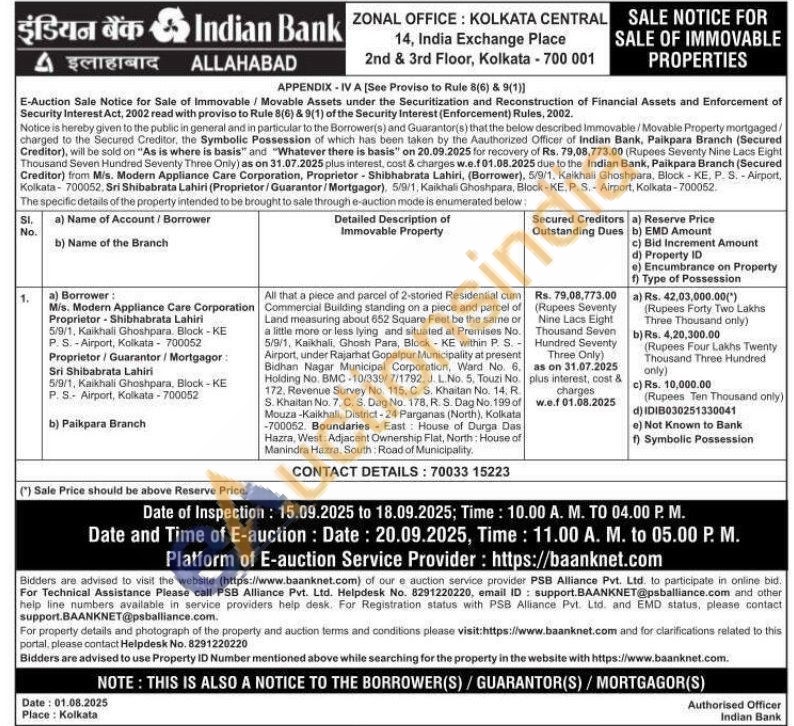 All that a piece and parcel of 2-storied Residential cum Commercial Building standing on a piece and parcel of Land measuring about 652 Square Feet be the same or a little more or less lying and situated at Premises No. 5/9/1, Kaikhali, Ghosh Para, Block KE within P. S. Airport, under Rajarhat Gopalpur Municipality at present Bidhan Nagar Municipal Corporation, Ward No. 8. Holding No. BMC -10/339/7/1792. J. L. No. 5, Touzi No. 172. Revenue Survey No. 115. C. S. Khaitan No. 14. R. S. Khaitan No. 7. C. S. Dag No. 178, R. S. Dag No. 199 of Mouza-Kaikhali, District-24 Parganas (North), Kolkata -700052. Boundaries East House of Durga Das Hazra, West: Adjacent Ownership Flat, North: House of Manindra Hazra, South Road of Municipality.