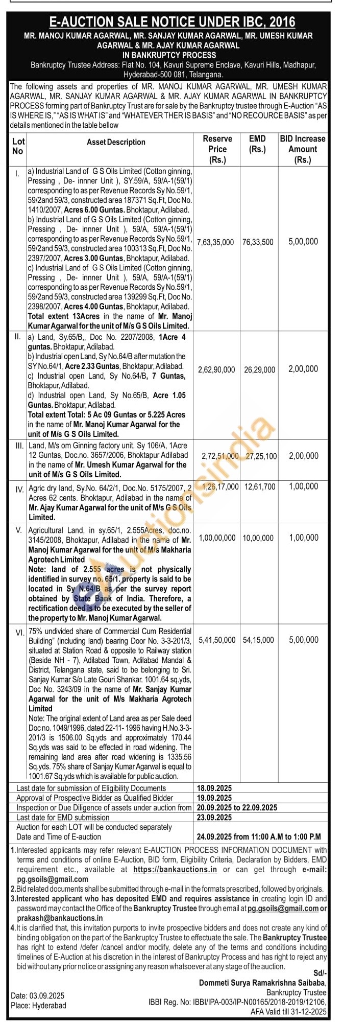 Land, M's om Ginning factory unik. Sy 106A, 1Aars 12 Guntas. Docno 3857/2006, Bhoktapur Adilabad in The name of Mr. Umesh Kumar Agarwal for the unit of Mis G5 Oils Limited.