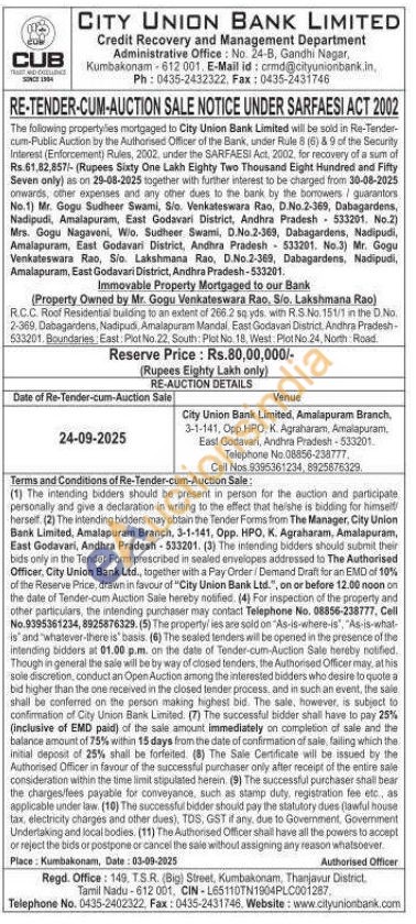 R.C.C. Roof Residential building to an extent of 266.2 sq yds. with R.S.No. 151/1 in the D.No. 2-369, Dabagardens, Nadipudi, Amalapuram Mandal, East Godavan District, Andhra Pradesh-533201. Boundaries, East: Plot No. 22, South: Plot No. 18. West Plot No.24, North Road.