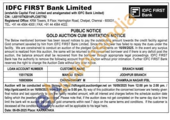 IDFC First Bank Ltd Gold Auctions Auction in Jodhpur