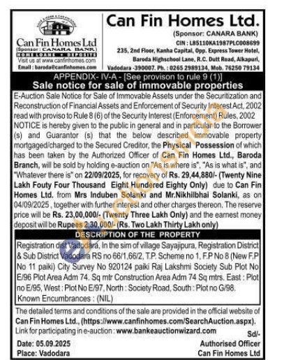 Registration dist Vadodara, In the sim of village Sayajipura, Registration District & Sub District Vadodara RS no 66/1,66/2, T.P. Scheme no 1, F.P No 8 (New F.P No 11 paiki) City Survey No 920124 paiki Raj Lakshmi Society Sub Plot No E/96 Plot Area Adm 74. Sq mtr Construction Area Adm 74 Sq mtrs. East: Piot no E/95, West: Plot No E/97, North: Society Road, South: Plot no G/98. Known Encumbrances: (NIL)
