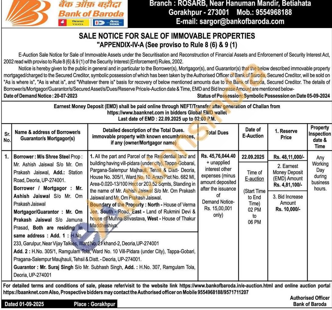 .All the part and Parcel of the Residential land and building having vill-pidara (under city), Tappa-Gobarai, Pargana-Salempur Majhauli, Tehsil & Distt- Deoria, House No. 305/1, Ward No. 10, Arazi/Plot No. 682 MI, Area-0.020-13/100 Hect or 203.52 Sqmts, Standing in the name of Mr. Ashish Jaiswal S/o Mr. Om Prakash Jaiswal and Mr. Om Prakash Jaiswal.