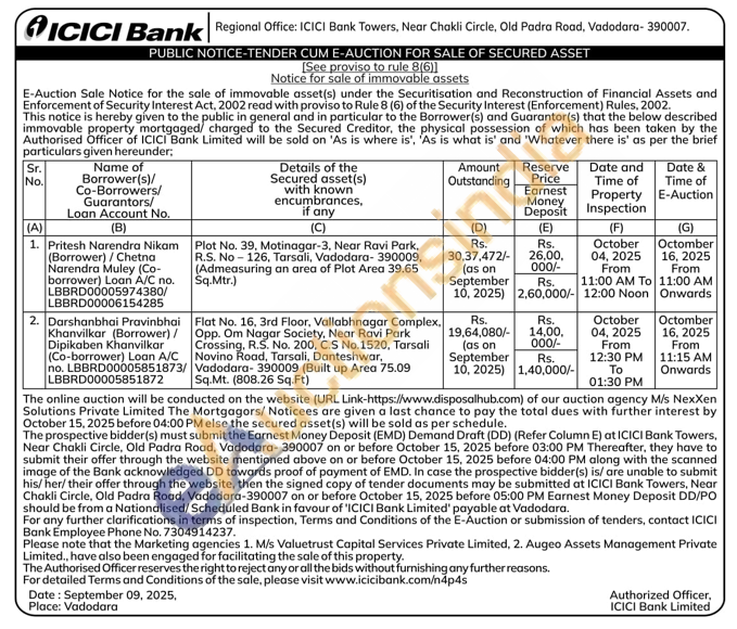 Plot No. 39, Motinagar-3, Near Ravi Park, R.S. No-126, Tarsali, Vadodara-390009, (Admeasuring an area of Plot Area 39.65 Sq.Mtr.)