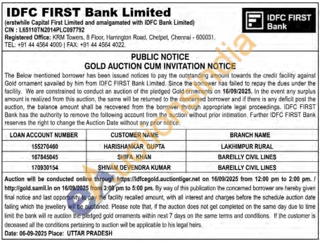 IDFC First Bank Ltd Gold Auctions Auction in Chennai