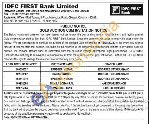 IDFC First Bank Ltd Gold Auctions Auction in Chennai