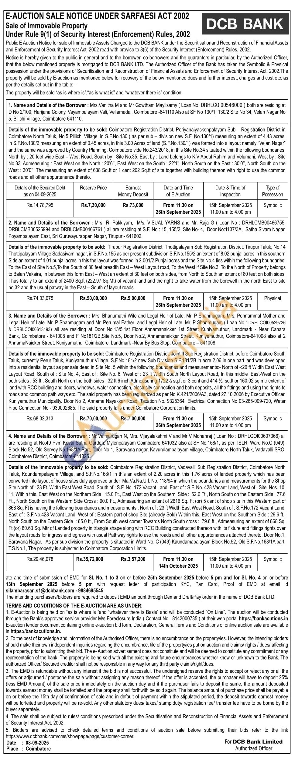 4) Coimbatore Registration District, Vadavalli Sub Registration District, Coimbatore North Taluk, Koundampalayam Village, and S.F.No. 168/1 in this an extent of 2.20 acres in this 1.76 acres of landed property which has been converted into layout of house sites duly approved under Ma.Va.Na.U.I. No. 118/94 in which the boundaries and measurements for the Shop Site North of: 23 Ft. Width East West Road, South of: S.F. No. 172 Vacant Land, East of: S.F. No. 428 Vacant Land, West of: Site. Nos. 10, 11. Within this, East West on the Northern Side: 15.0 Ft., East West on the Southem Side: 52.6 Ft., North South on the Eastern Side: 77.6 Ft., North South on the Western Side Cross: 90.0 Ft., Admeasuring an extent of 2616 Sq. Ft (or) 5 cent of shop site in this Western part of 868 Sq. Ft is having the following boundaries and measurements: North of: 23 ft Width East West Road, South of: S.F.No.172 Vacant Land, East of: S.F.No.428 Vacant Land, West of Eastern part of shop Site (already Sold) Within this, East West on the Southern Side: 29.6 ft.. North South on the Eastern Side: 65.0 ft., From South west comer Towards North South cross: 79.6 ft., Admeasuring an extent of 868 Sq. Ft (or) 80.63 Sq. Mtr of Landed property in triangle shape along with RCC Building constructed thereon with its fixture and fittings rights over the layout roads for ingress and egress with usual Pathway rights to use the roads and all other appurtenances attached thereto, Door No.1, Saravana Nagar. As per sub division the property is situated in Ward No. C (049) Kaundamapalayam Block No.52. Old S.F.No. 168/1A part, T.S.No. 1, The property is subjected to Coimbatore Corporation Limits.