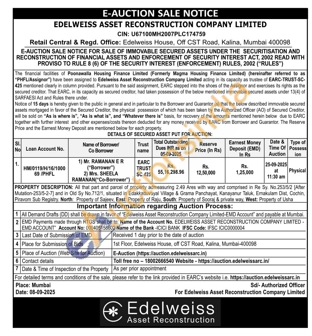 All that part and parcel of property admeasuring 2.49 Ares with way and comprised in Re Sy. No.253/5/2 [After Mutation-253/5-2-7] and in Old Sy No.712/1, situated in Edakkattuvayal Village & Grama Panchayat, Kanayanur Taluk, Ernakulam Dist, Cochin, Piravom Sub Registry. North: Property of Sajeev, East: Property of Raju, South: Property of Sooraj & private way, West: Property of Usha