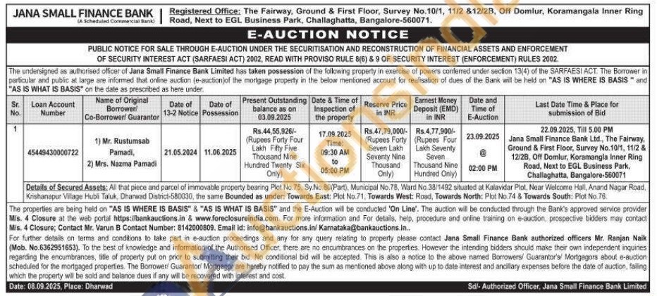 All that piece and parcel of immovable property bearing Plot No.75, Sy.No.80(Part), Municipal No.78, Ward No. 38/1492 situated at Kalavidar Plot, Near Welcome Hall, Anand Nagar Road, Krishanapur Village Hubli Taluk, Dharwad District-580030, the same Bounded as under: Towards East: Plot No.71, Towards West: Road, Towards North: Plot No.74 & Towards South: Plot No.76