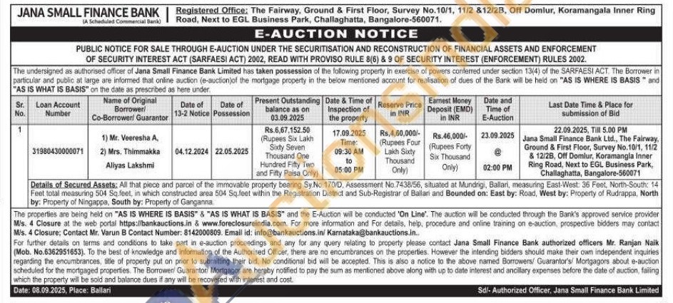 All that piece and parcel of the immovable property bearing Sy No. 170/D, Assessment No. 7438/56, situated at Mundrigi, Ballari, measuring East-West: 36 Feet, North-South: 14 Feet total measuring 504 So feet, in which constructed area 504 Sq.feet within the Registration District and Sub-Registrar of Ballari and Bounded on: East by: Road, West by: Property of Rudrappa, North by: Property of Ningappa, South by: Property of Ganganna
