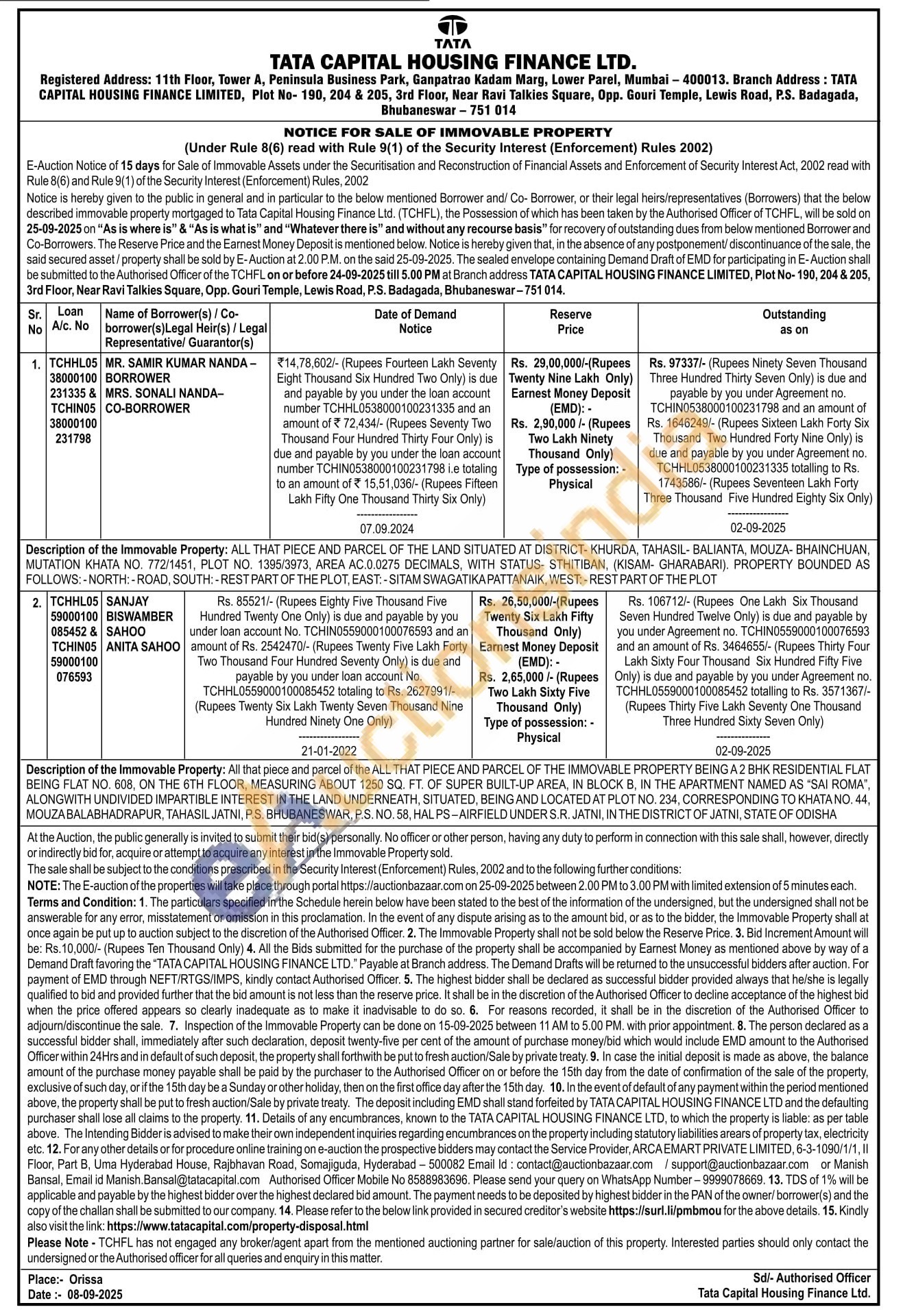 2) All that piece and parcel of the ALL THAT PIECE AND PARCEL OF THE IMMOVABLE PROPERTY BEING A 2 BHK RESIDENTIAL FLAT BEING FLAT NO. 608, ON THE 6TH FLOOR, MEASURING ABOUT 1250 SQ. FT. OF SUPER BUILT-UP AREA, IN BLOCK B, IN THE APARTMENT NAMED AS "SAI ROMA", ALONGWITH UNDIVIDED IMPARTIBLE INTEREST IN THE LAND UNDERNEATH, SITUATED, BEING AND LOCATED AT PLOT NO. 234, CORRESPONDING TO KHATANO. 44, MOUZA BALABHADRAPUR, TAHASIL JATNI, P.S. BHUBANESWAR, P.S. NO. 58, HAL PS-AIRFIELD UNDER S.R. JATNI, IN THE DISTRICT OF JATNI, STATE OF ODISHA