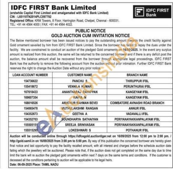IDFC First Bank Ltd Gold Auctions Auction in Tiruppur