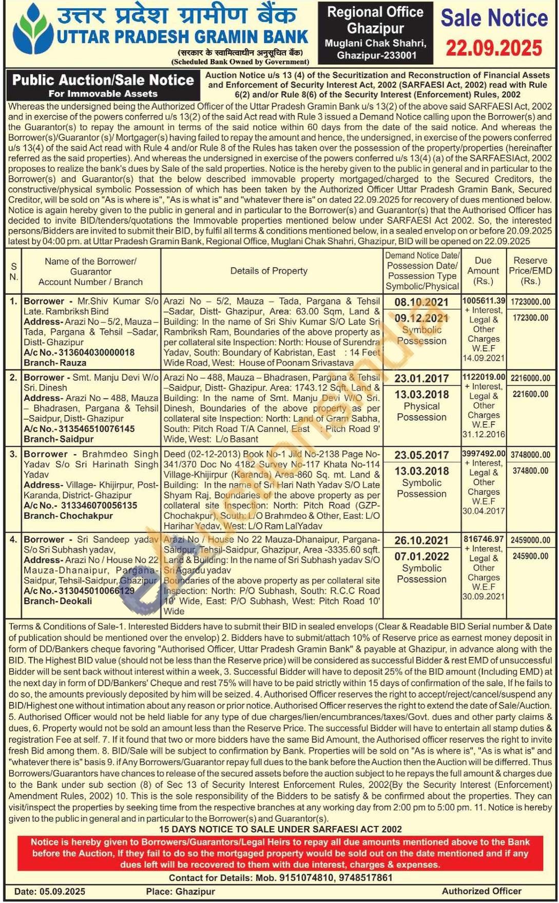 Arazi No 5/2, Mauza Tada, Pargana & Tehsil -Sadar, Distt- Ghazipur, Area: 63.00 Sqm, Land & Building: In the name of Sri Shiv Kumar S/O Late Sri Rambriksh Ram, Boundaries of the above property as per collateral site Inspection: North: House of Surendra Yadav, South: Boundary of Kabristan, East: 14 Feet Wide Road, West: House of Poonam Srivastava