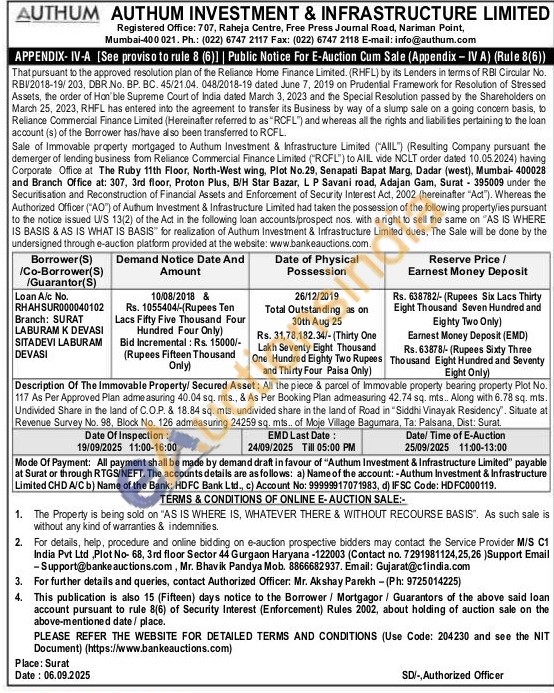 Description Of The Immovable Property/ Secured Asset: All the piece & parcel of Immovable property bearing property Plot No. 117 As Per Approved Plan admeasuring 40.04 sq. mts., & As Per Booking Plan admeasuring 42.74 sq. mts.. Along with 6.78 sq. mts. Undivided Share in the land of C.O.P. & 18.84 sq. mts. undivided share in the land of Road in "Siddhi Vinayak Residency". Situate at Revenue Survey No. 98, Block No. 126 admeasuring 24259 sq. mts.. of Moje Village Bagumara, Ta: Palsana, Dist: Surat