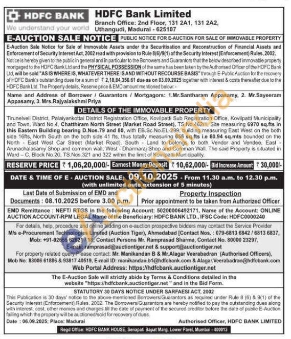 contact: Mr. Manikandan B & Mr.Alagar Veerabadran (Authorised Officers), Mob No: 83006 61886 & 93817 40519
