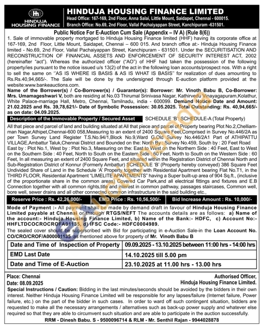 All that piece and parcel of land and building situated at All that piece and parcel of Property bearing Plot No.2, Chelliam-man Nagar Athipet, Chennai-600 058. Measuring to an extent of 2400 Square Feet, Comprised in Survey No.446/2A as per Town Survey Land Register T.S.No.94/1,Block No.9, Ward G.Old Survey No.446/2A1 Part of ATHIPATTU VILLAGE, Ambattur Taluk, Chennai District and Bounded on the: North By: Survey No.459, South by: 20 Feet Road East by: Plot No.1, West by: Plot No.3, Maesuring on the: East to West on the Northern Side: 40 Feet, East to West on the Southern Side: 40 Feet, North to South on the Eastern Side: 60 Feet, North to South on the Western Side: 60 Feet, In all measuring an extent of 2400 Square Feet, and situated within the Registration District of Chennai North and Sub-Registration District of Konnur (Formerly Ambattur) SCHEDULE 'B' (Property hereby conveyed) 386 Square Feet Undivided Share of Land in the Schedule 'A' Property together with Residential Apartment bearing Flat No.T1, in the THIRD FLOOR, Residential Apartment "LIMELITE APARTMENTS" having a Super built-up area of 904 Sq.ft., (inclusive of the proportionate share in the common areas) Covered Car Park,and all electrical fittings and fixtures and E.B Connection together with all common rights,title and interest in common pathway, passages staircases, Common well, bore well, sewer drains and all other connected common infrastructure in the said building etc.