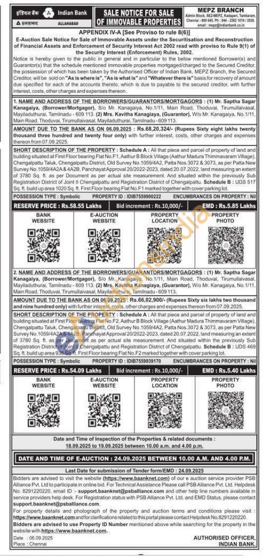 1) Schedule A: All that piece and parcel of property of land and building situated at First Floor bearing Flat No. F1. Aathur B Block Village (Aathur Madura Thimmavaram Village) Chengalpattu Taluk, Chengalpattu District. Old Survey No. 1059/4A2, Patta Nos. 3072 & 3073, as per Patta New Survey No. 1058/4A2A & 4A2B, Panchayat Approval 20/2022-2023, dated 20.07.2022, land measuring an extent of 3780 Sq. ft. as per Document as per actual site measurement. And situated within the previously Sub Registration District of Joint II Chengalpattu and Registration District of Chengalpattu. Schedule B: UDS 517 Sq. ft. build up area 1020 Sq. ft. First Floor bearing Flat No. F1 marked together with cover parking lot