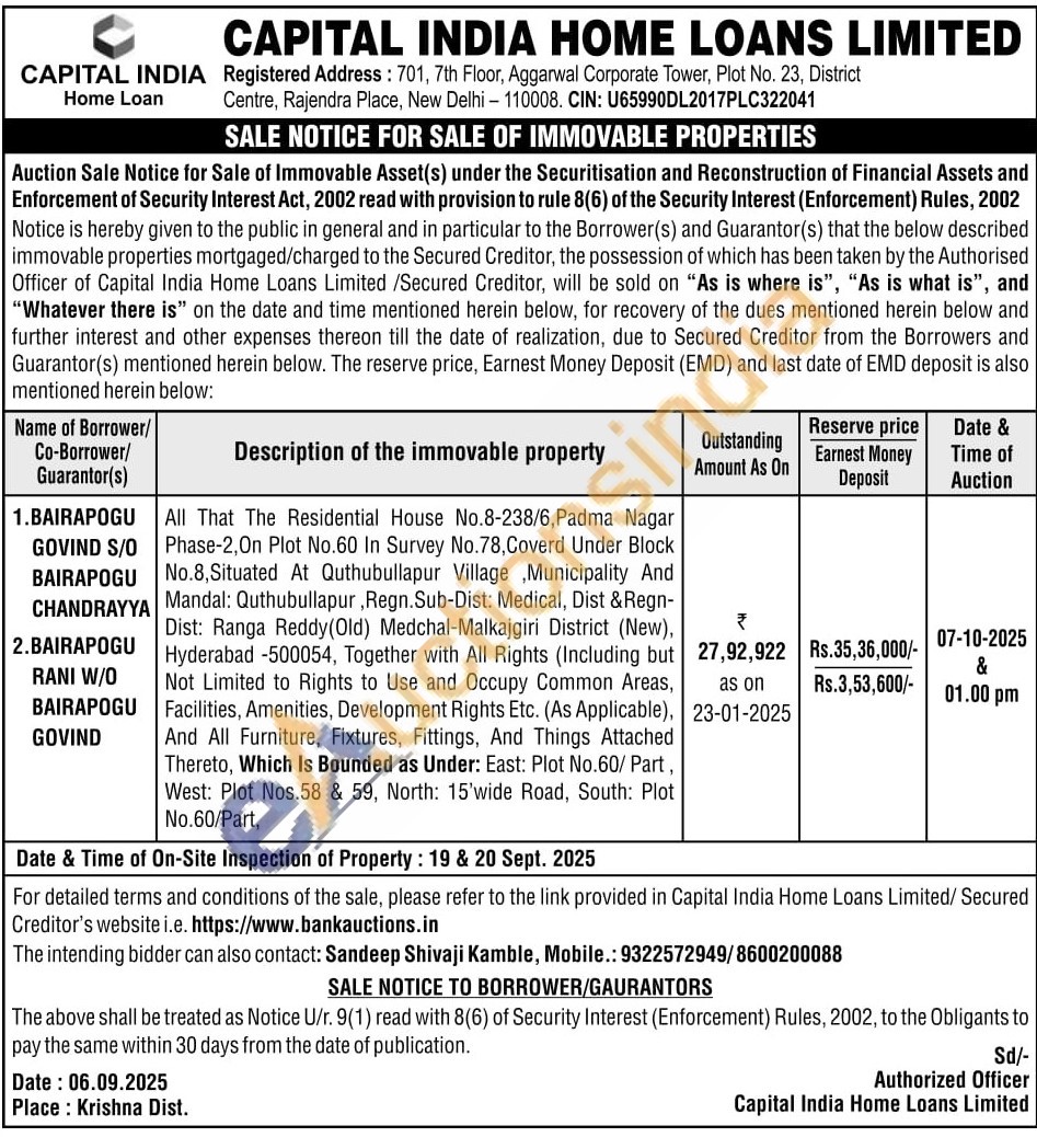 All That The Residential House No.8-238/6, Padma Nagar Phase-2, On Plot No.60 In Survey No.78, Coverd Under Block No.8, Situated At Quthubullapur Village,Municipality And Mandal: Quthubullapur, Regn. Sub-Dist: Medical, Dist & Regn-Dist: Ranga Reddy (Old) Medchal-Malkajgiri District (New), Hyderabad -500054, Together with All Rights (Including but Not Limited to Rights to Use and Occupy Common Areas, Facilities, Amenities, Development Rights Etc. (As Applicable), And All Furniture, Fixtures, Fittings, And Things Attached Thereto, Which Is Bounded as Under: East: Plot No.60/ Part, West: Plot Nos.58 & 59, North: 15'wide Road, South: Plot No.60/Part