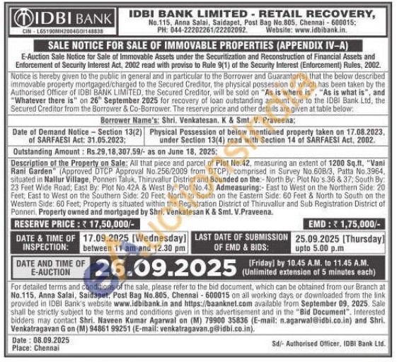 All that piece and parcel of Plot No.42, measuring an extent of 1200 Sq.ft. "Vani Rani Garden (Approved DTCP Approval No 256/2009 from DTCP), comprised in Survey No.608/3, Patta No.3964, situated in Nallur Village, Ponneri Taluk, Thiruvallur District and Bounded on the:-North By: Plot No's.36 & 37, South By: 23 Feet Wide Road; East By: Plot No 42A & West By: Plot No.43, Admeasuring:- East to West on the Northern Side: 20 Feet, East to West on the Southern Side: 20 Feet, North to South on the Eastern Side: 60 Feat & North to South on the Western Side: 60 Feet, Property is situated within the Registration District of Thiruvallur and Sub Registration District of Ponneri. Property owned and mortgaged by Shri. Venkatesan K & Smt. V.Praveena