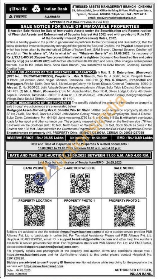 All that piece and parcel of property situated at SF No.74/8B, Site No.5, Door No. 200/23 Jothi Aakash Galaxy, Village - Kangeyampalayam, Taluk & District-Sulur. Zone: Coimbatore, Pin-641401, land measuring 2730 Sq. ft. or 6 Cents 116 Sq. ft. with a right over layout roads for transport and other common use. The property measuring East West on the Northem side: 76 feel. East West on the Southem side: 80 feet, North South on Western side: 35 feet. North South as cross in the Eastern side: 35 feet. Situated within the Coimbatore Registration District and Sulur Sub Registration District. Encumbrances on property: Nil. PROPERTY ID No.: IDIB6731383001A. CERSAL ID: 200021267358